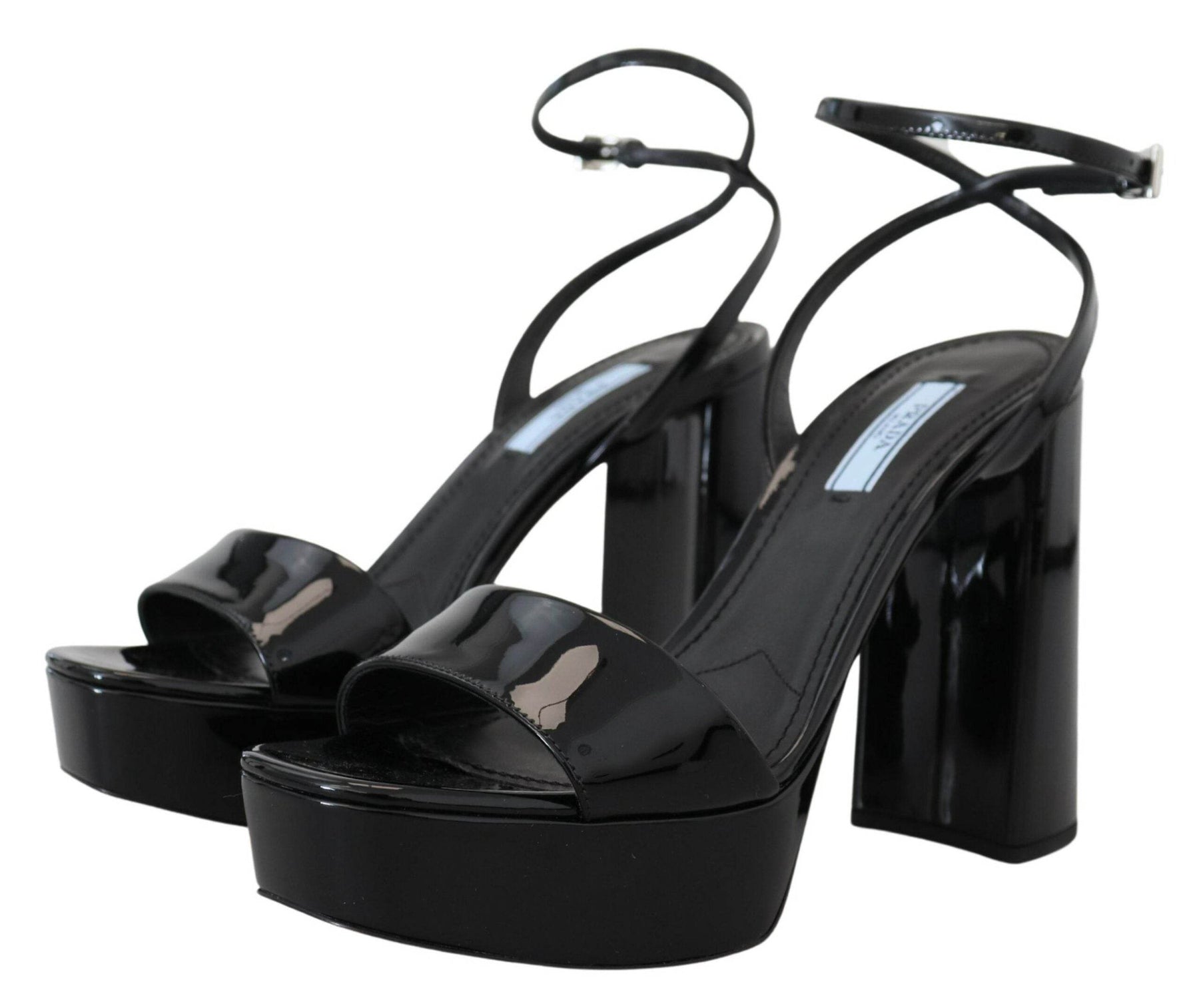 Startseite / Shop / Prada Schwarze Lacksandalen Knöchelriemen Heels Leder